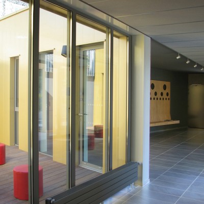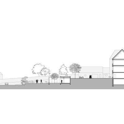 L’idée du projet est de s’intégrer dans le dénivelé par un bâtiment de plain- pied. L’école vient composer avec l’aspect massif de la salle de spectacle et laisse la vue dégagée vers l’ancien couvent.