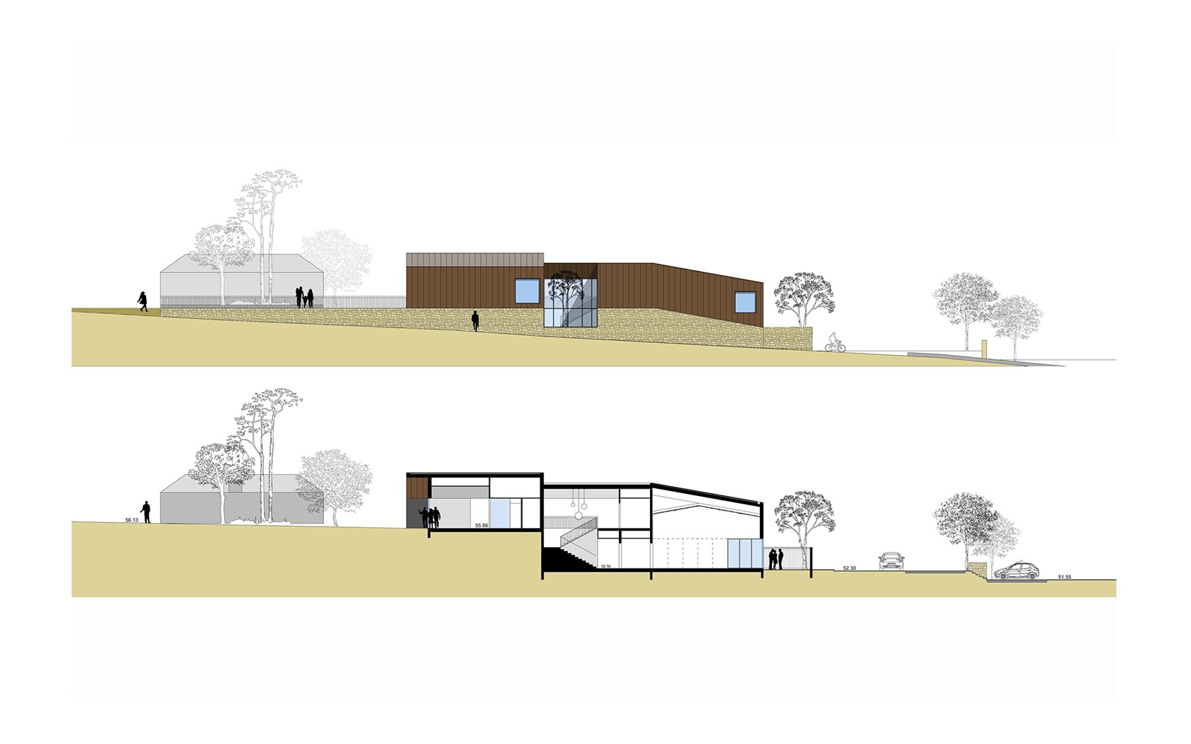 Au rez-de-chaussée bas se trouvent la salle du conseil, la salle de réception. L’organisation en croix permet de séparer les deux salles, chacune doit pouvoir fonctionner séparément. Un hall et des locaux sont communs : office, sanitaires. Par contre chaque salle possède un accès direct sur l’extérieur : pour la salle du conseil, un parvis ; pour la salle de réception un jardin fermé sécurisé.