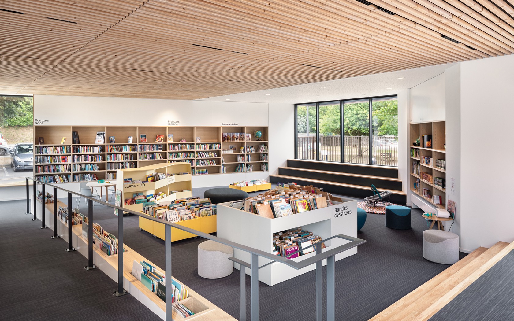 En contrebas, l’espace de consultation de 240 m2 s’ouvre sur le parc et l’espace scénique de verdure. Une terrasse extérieure en bois prolonge l’espace de consultation pour des lectures aux beaux jours et crée un espace tampon avec le cimetière. Un plafond en bois ajouré accompagne le mouvement de la toiture jusqu’au hall et une rampe amène vers le coin lecture des enfants.