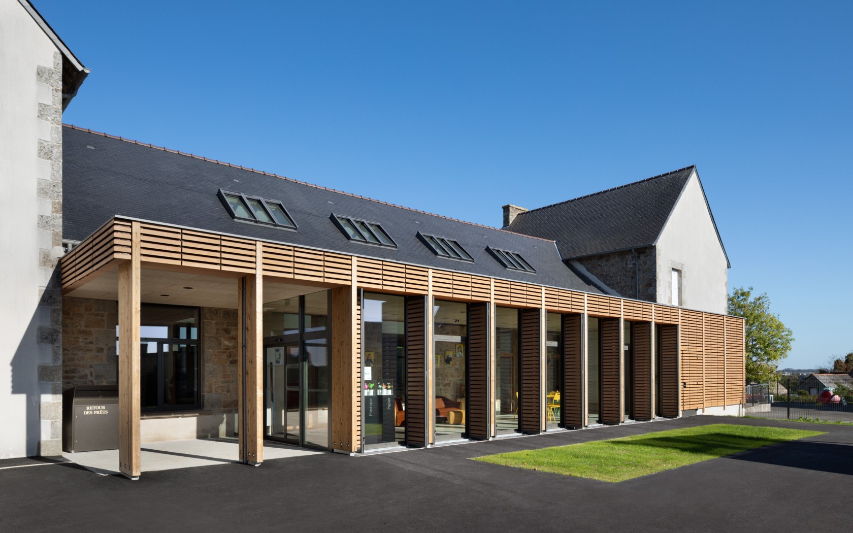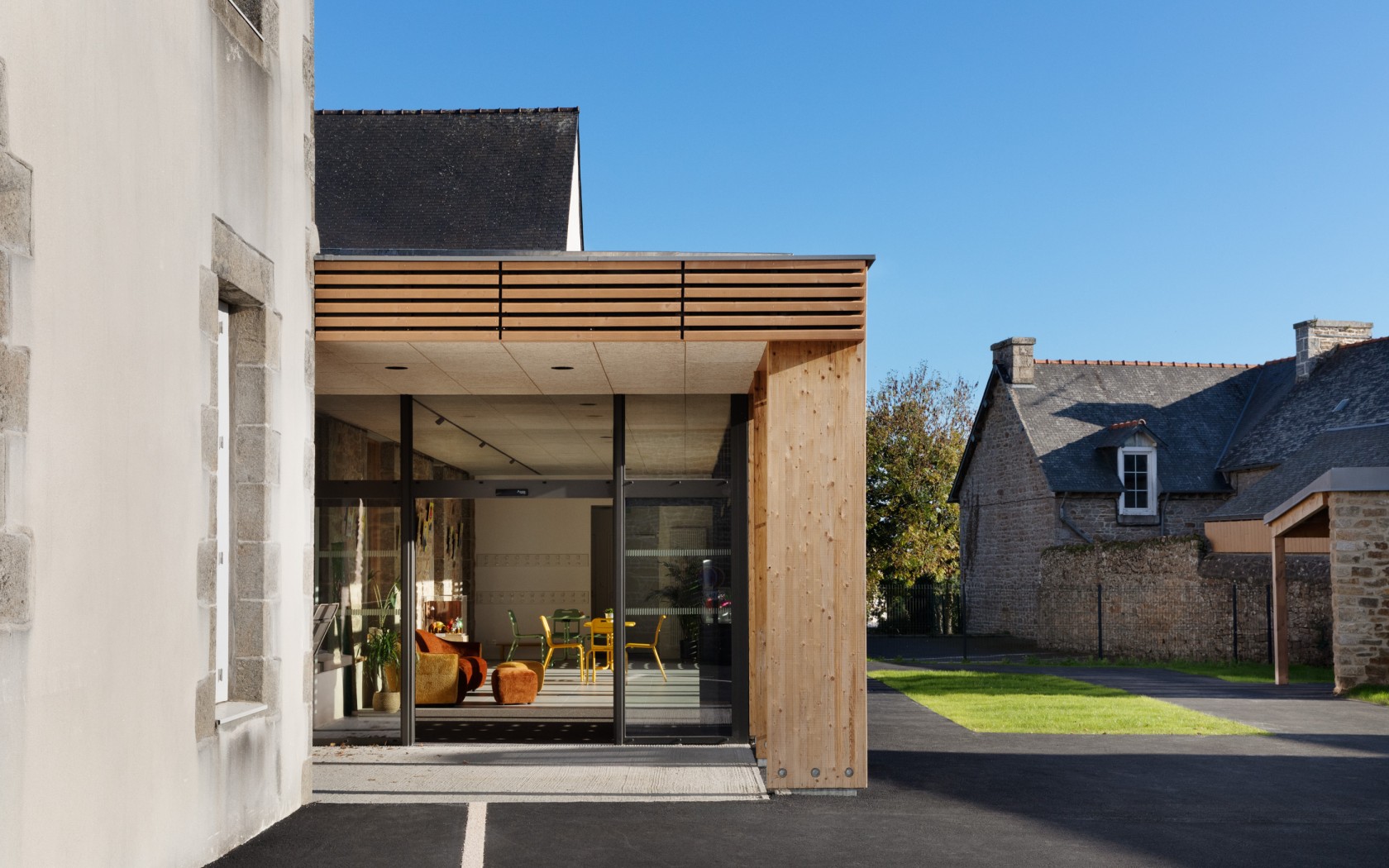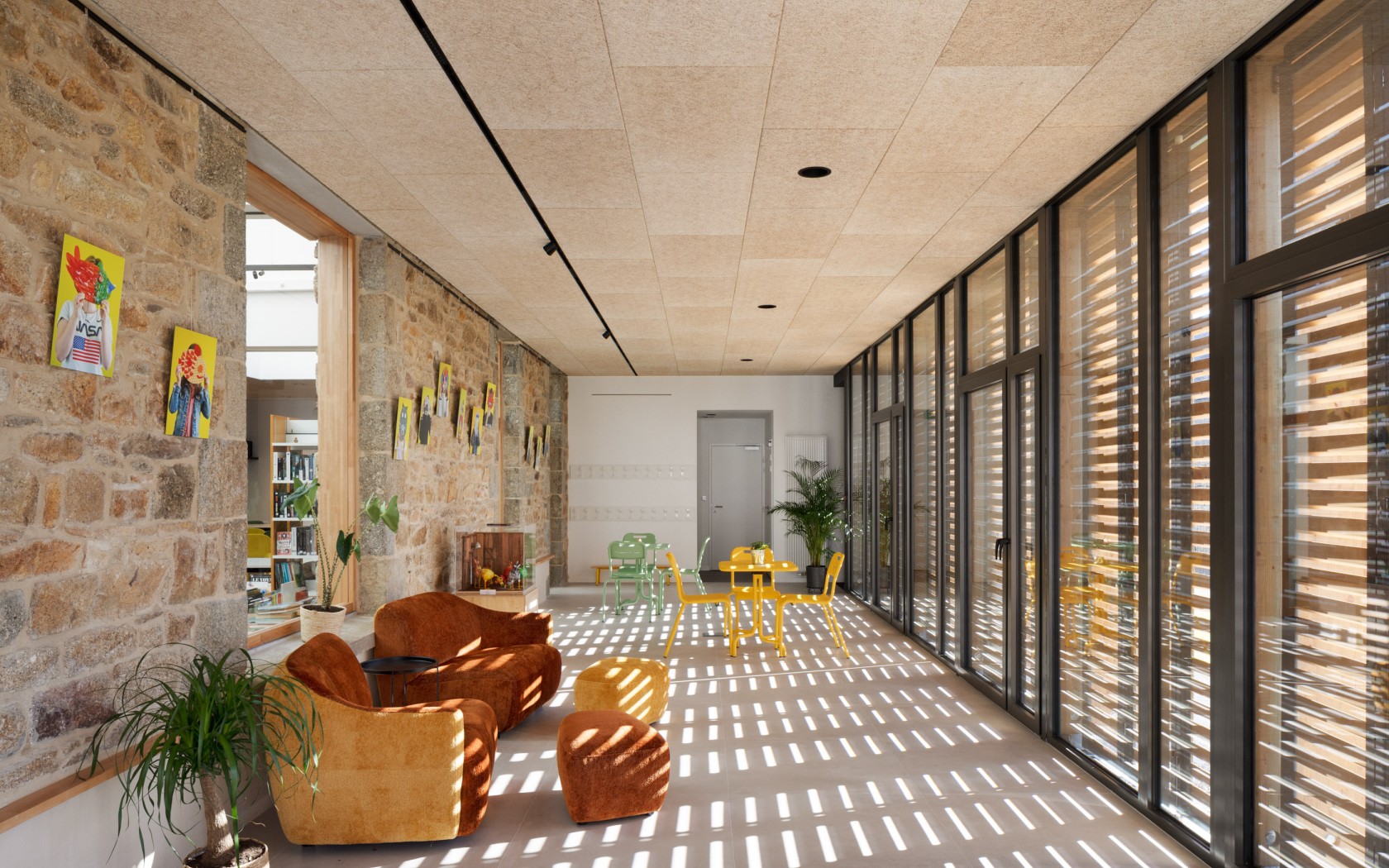 L’extension le long de la façade Sud, réalisée en ossature bois, fonctionne comme un espace intermédiaire : accueil du public et transition avec la cour, expositions, lecture, travail,… Elle joue un véritable rôle de régulateur thermique grâce aux volets persiennés très faciles à manipuler : on récupère des calories gratuites en hiver et c’est un espace de lecture apprécié au moindre rayon de soleil ; En été la façade s’ouvre largement derrière les persiennes pour ventiler et limiter les surchauffes.