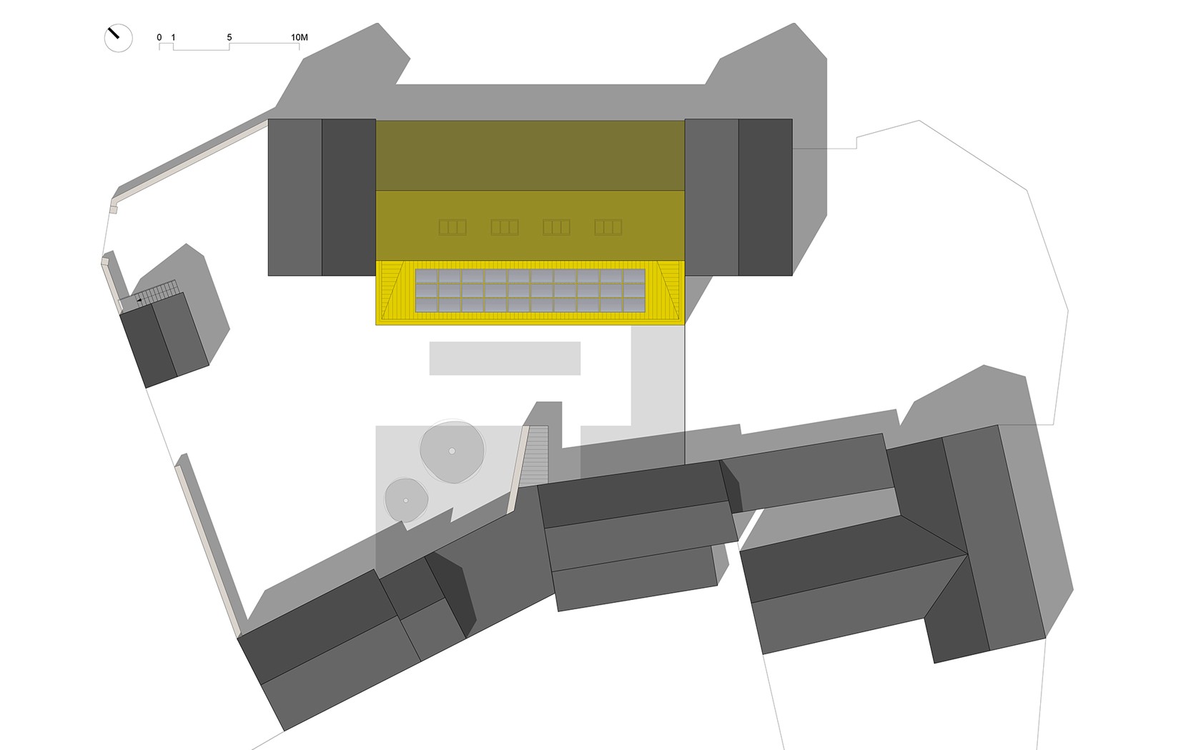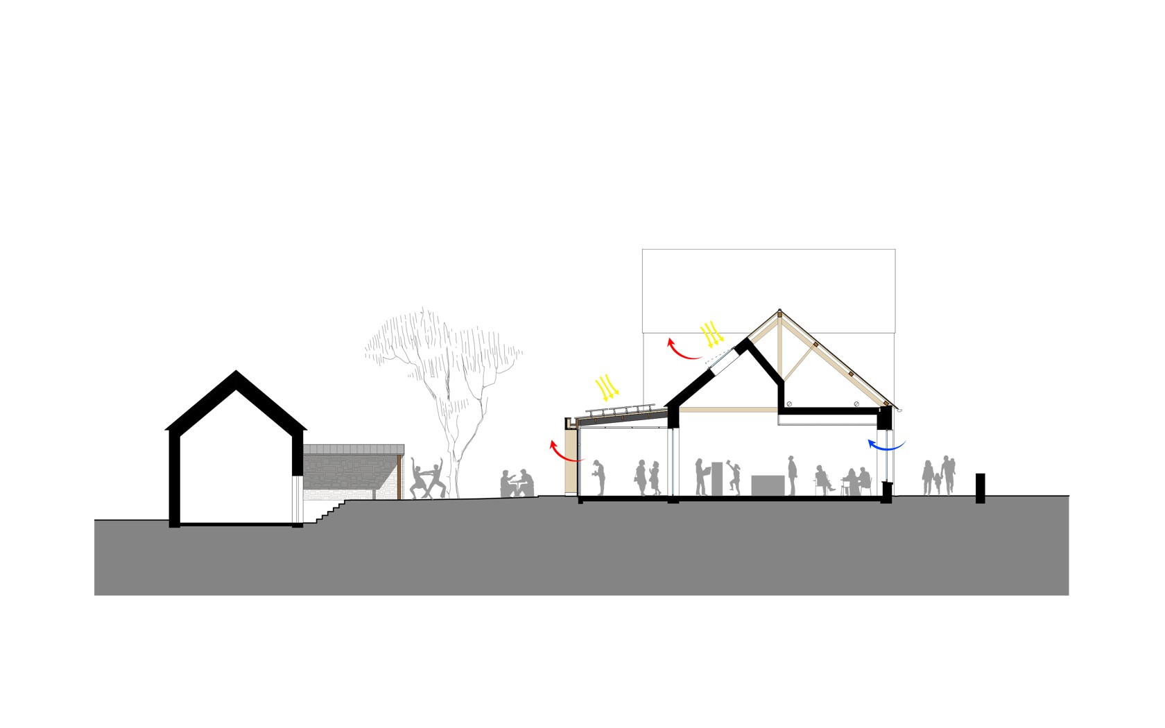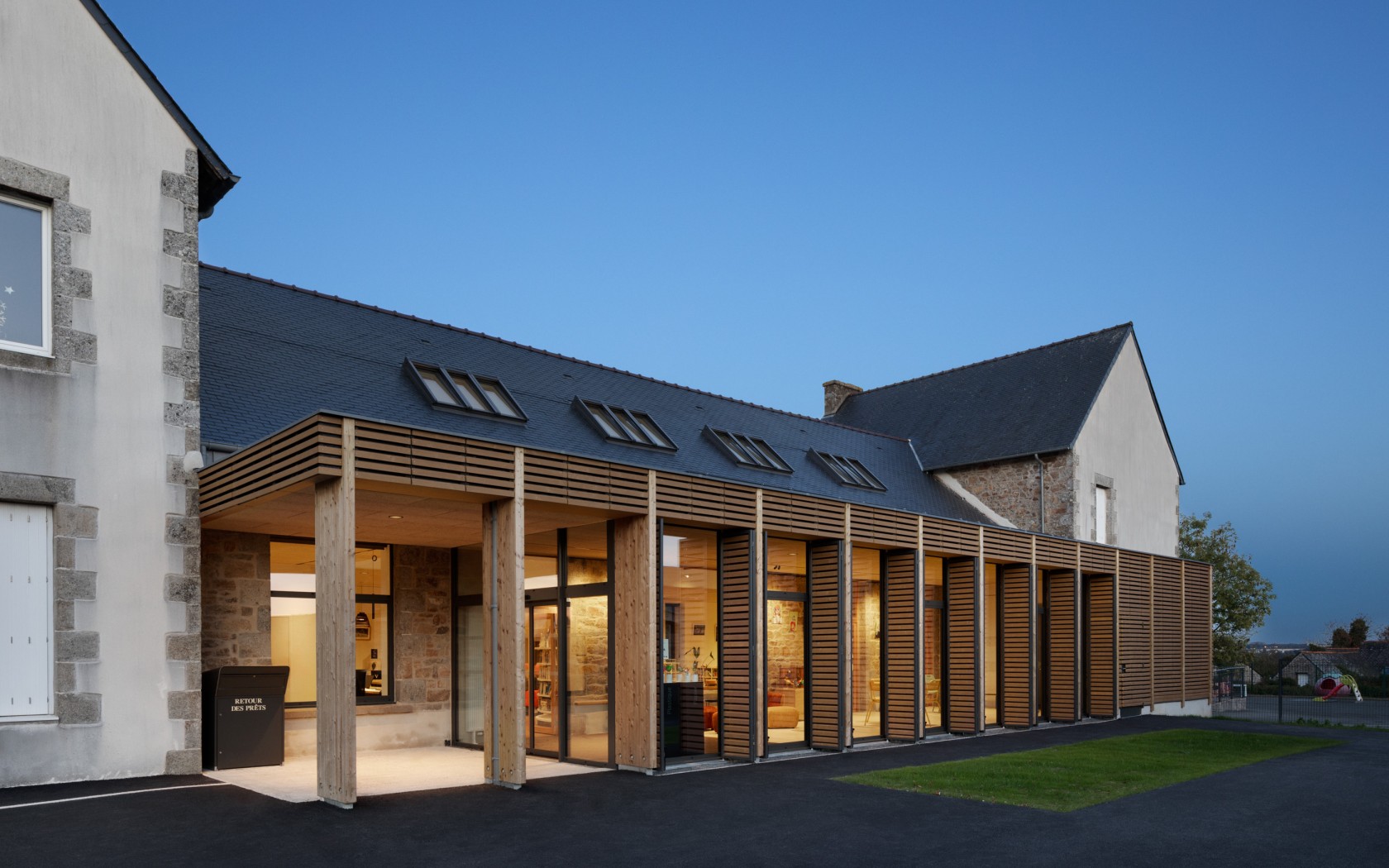 L’extension le long de la façade Sud, réalisée en ossature bois, fonctionne comme un espace intermédiaire : accueil du public et transition avec la cour, expositions, lecture, travail,… Elle joue un véritable rôle de régulateur thermique grâce aux volets persiennés très faciles à manipuler : on récupère des calories gratuites en hiver et c’est un espace de lecture apprécié au moindre rayon de soleil ; En été la façade s’ouvre largement derrière les persiennes pour ventiler et limiter les surchauffes.
