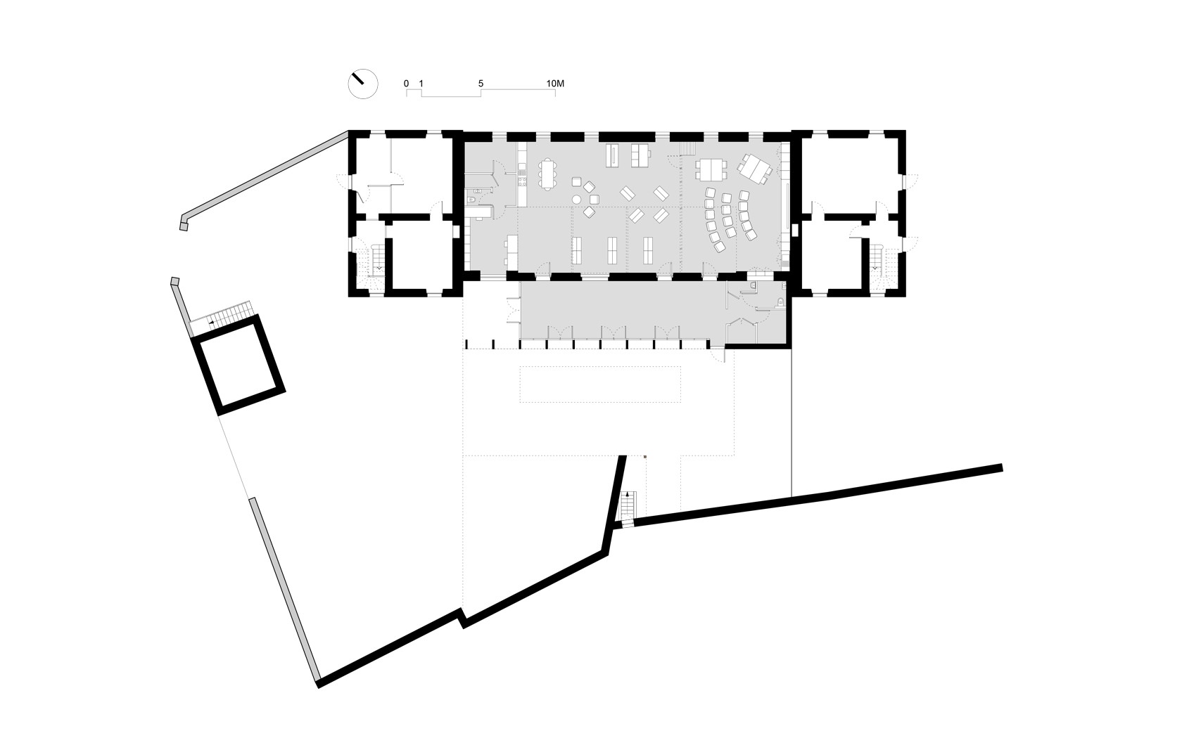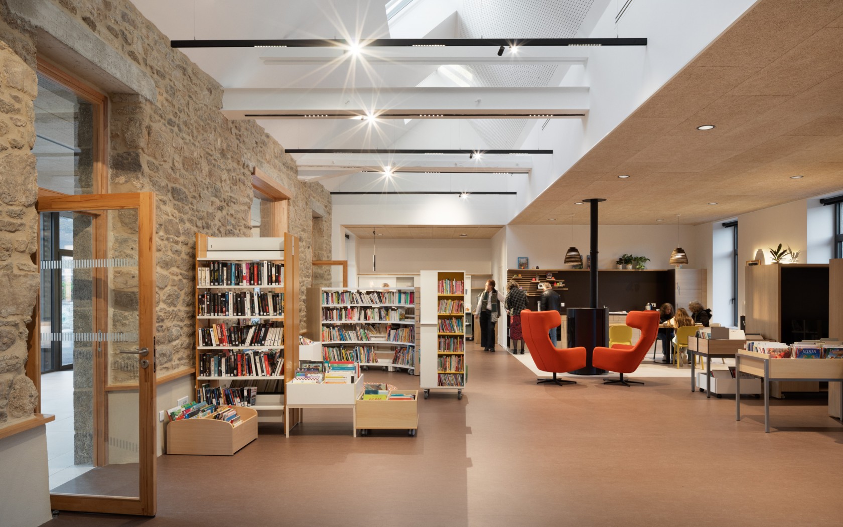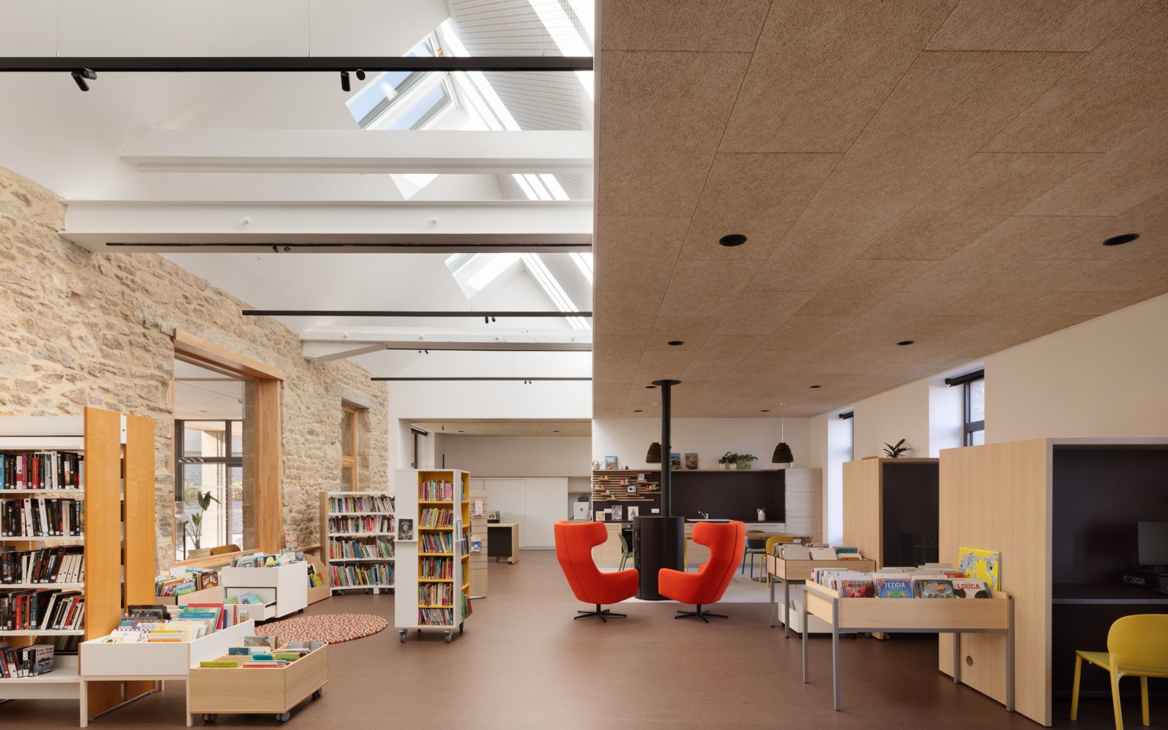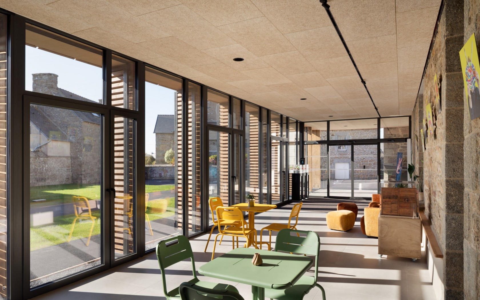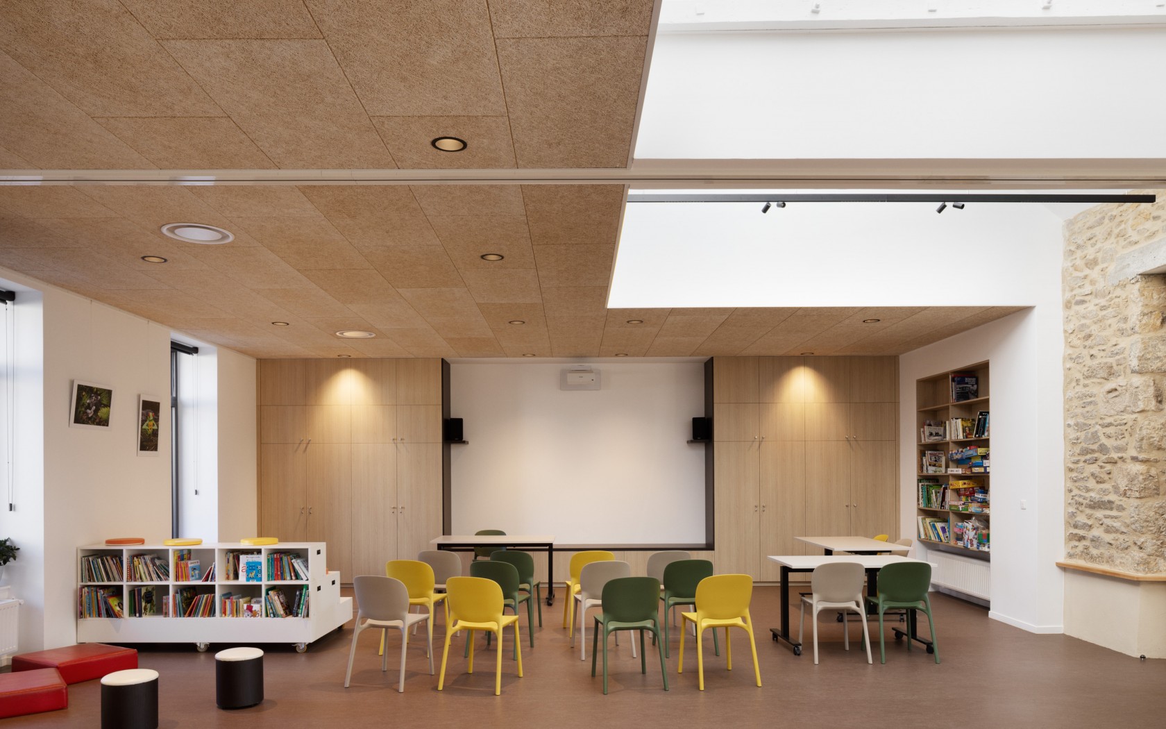 Nous avons souhaité limiter au strict minimum les éléments fixes pour laisser une grande liberté d’appropriation des espaces. Le mobilier modulable, dessiné et sélectionné en concertation avec la commune, suffit à proposer de multiples usages simultanés. La rénovation a été menée avec l’objectif d’utiliser au maximum des techniques traditionnelles et des matériaux biosourcés : enduits et joints chaux-sable, isolation en laine de bois.