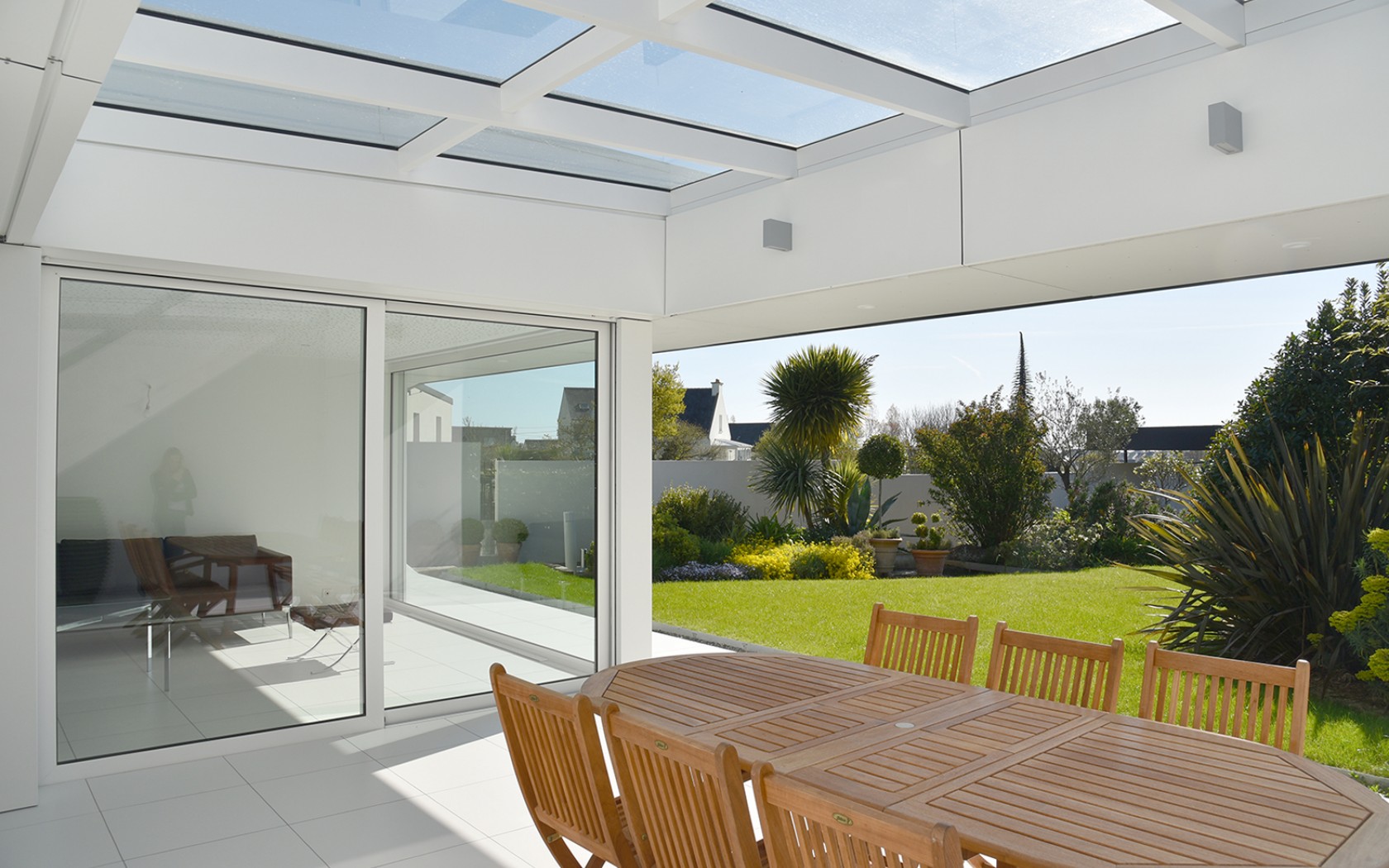 Notre travail porte sur la façon dont est vécue cette extension dans le séjour : dans cette construction des années 80, il s’agissait de ne pas marquer une rupture avec l’existant. Ainsi c’est tout le séjour qui est reconsidéré et son rapport avec le jardin. Après un travail de concertation avec le maître d’ouvrage, le choix se porte sur une extension en ossature bois qui se développe sur toute la largeur de la parcelle. La nouvelle construction intègre une terrasse couverte par une verrière, à l’abri des vents et baignée de lumière. Les travaux portent également sur quelques éléments de la maison : rangement, abri voiture et abri jardin. Cet ensemble s’étire en limite de propriété et s’ouvre vers la campagne.